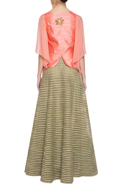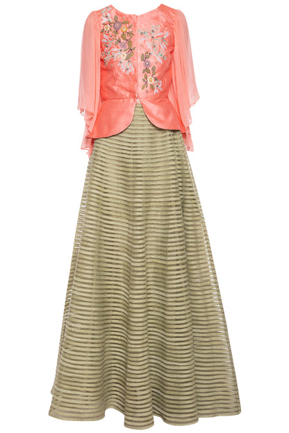 Featuring a candy pink jacket blouse in silk base with patched embroidery. It is paired with contrasting green striped skirt in net base.