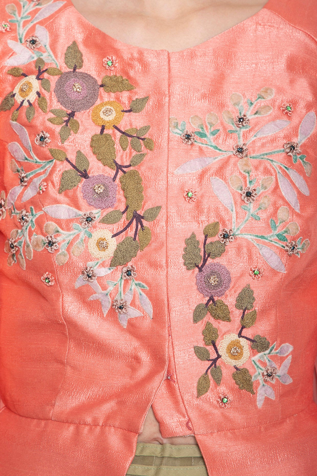 Candy pink embroidered jacket with green skirt