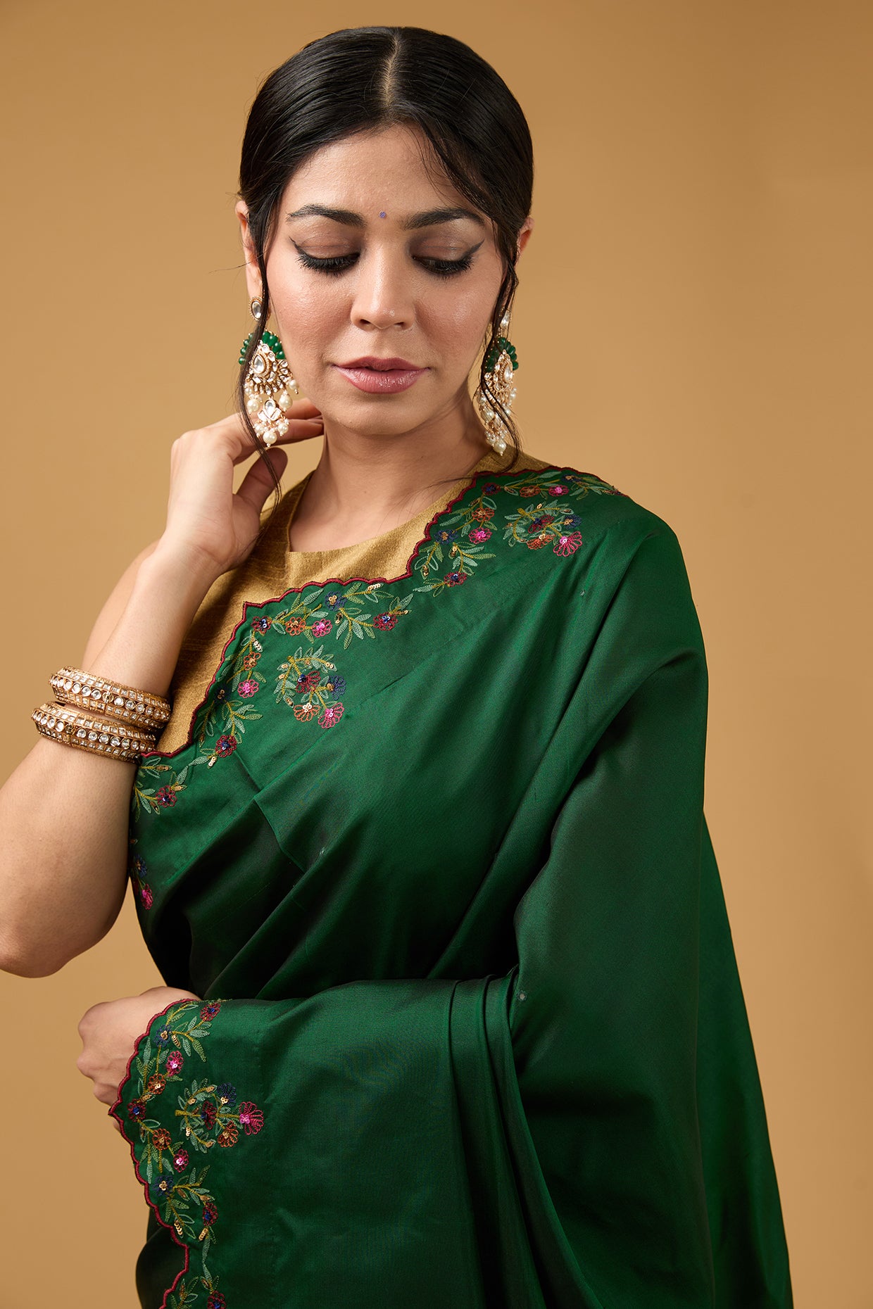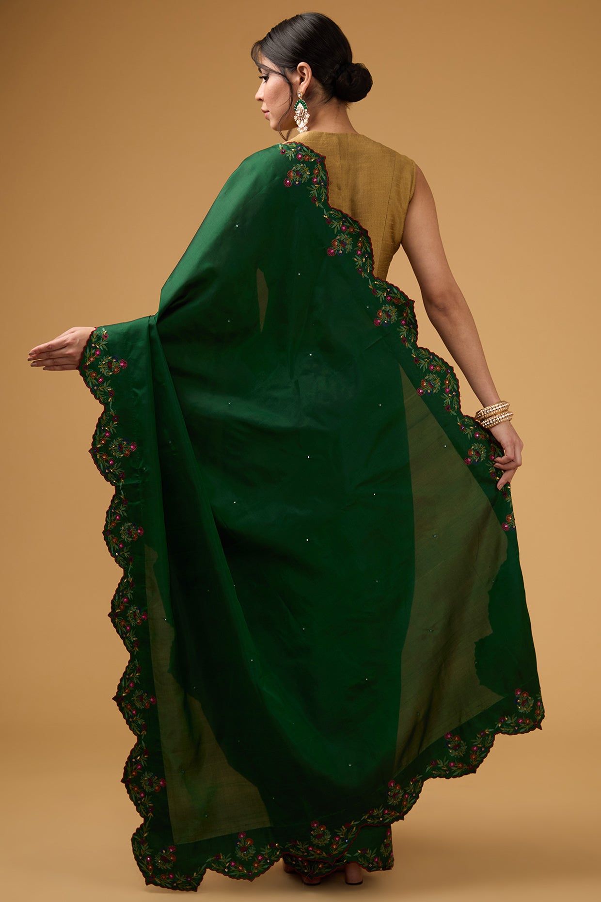 Featuring a dark forest green saree in silk base with floral embroidery. It is paired with a golden blouse. Accentuate it with statement jewellery and heels for a festive occasion.