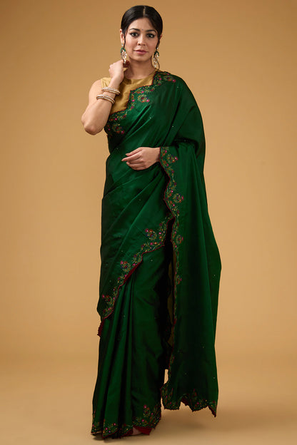 Dark Forest Green Silk Floral Embroidered Saree Set