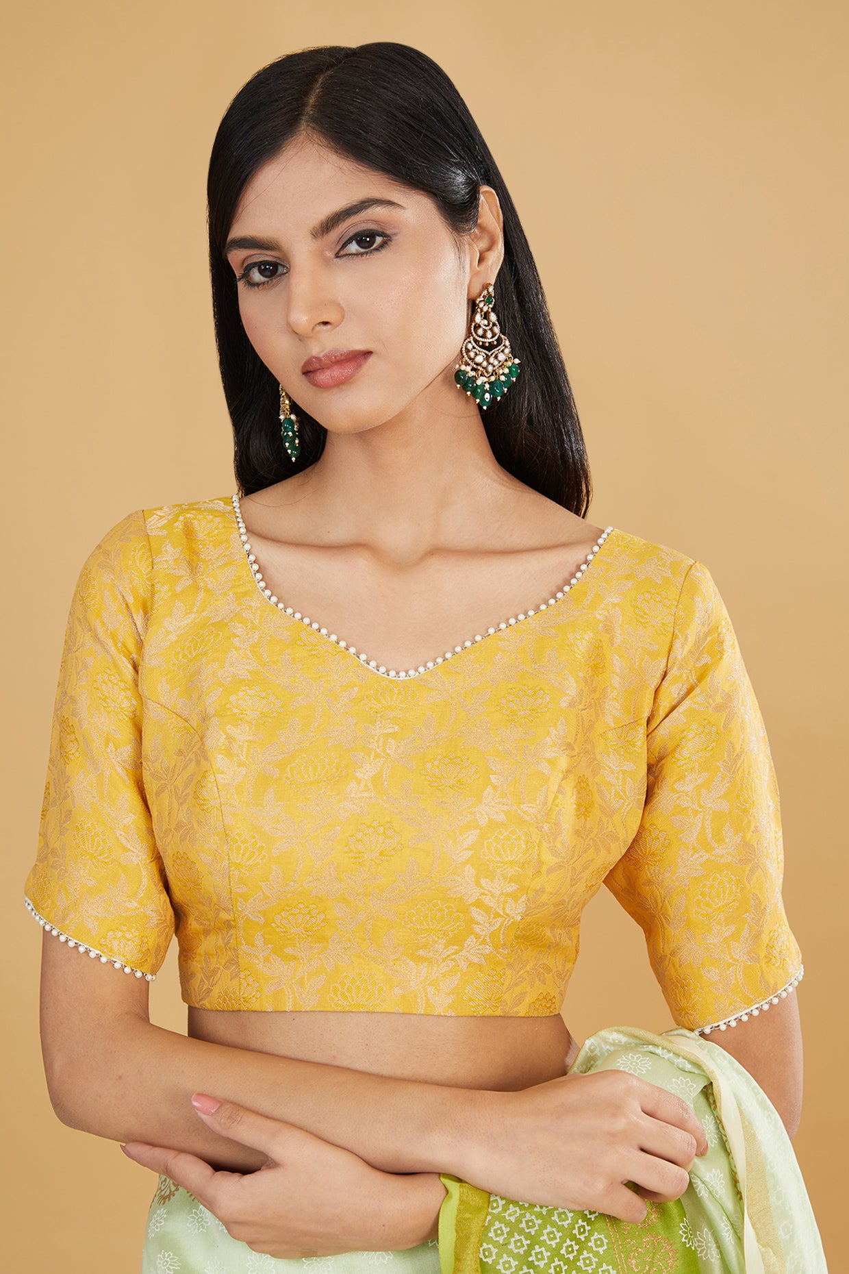 Featuring an ivory and green ombre saree in chanderi base with boota detail. It is paired with an embroidered blouse. Accentuate it with statement jewellery and heels for a festive occasion or pooja ceremony.