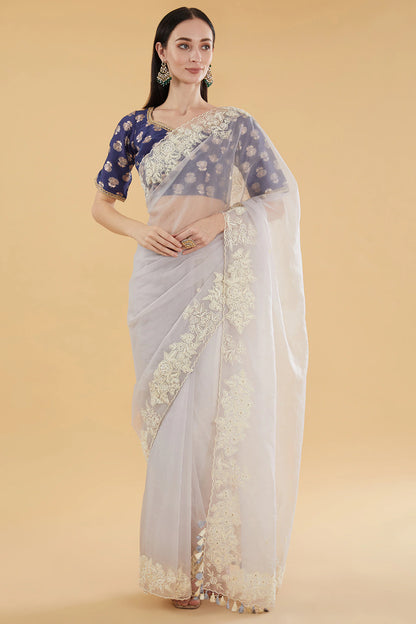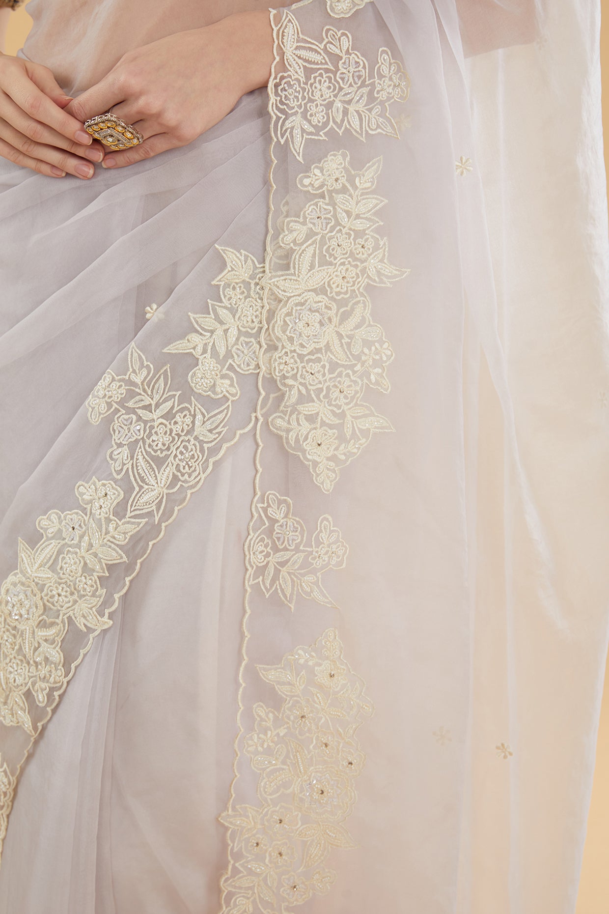 Featuring an ivory saree in organza base with floral embroidery. It is paired with a floral blouse. Accentuate it with statement jewellery and heels for a festive occasion or sangeet ceremony.