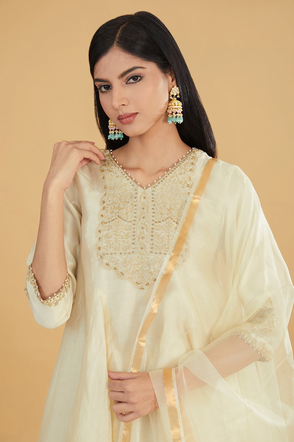 Featuring a light pista green kurta in cotton silk base with floral embroidery. It is paired with pants and a dupatta. Accentuate it with statement jewellery and heels for a festive occasion or mehendi ceremony.