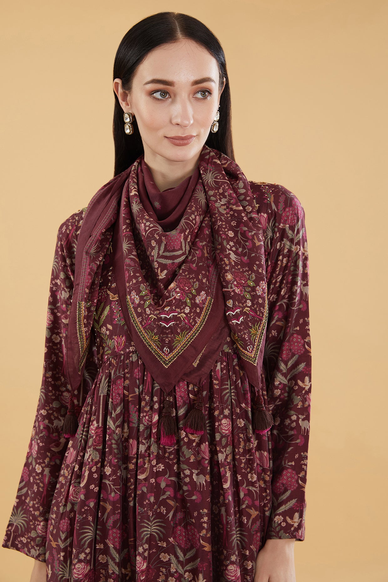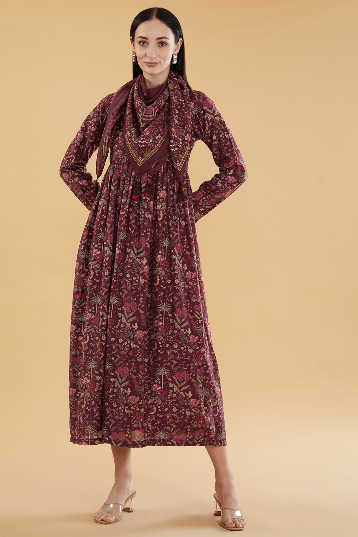 Featuring a maroon dress in cotton silk base with floral print. It is paired with a printed scarf. Accentuate it with statement jewellery and heels for casual wear.