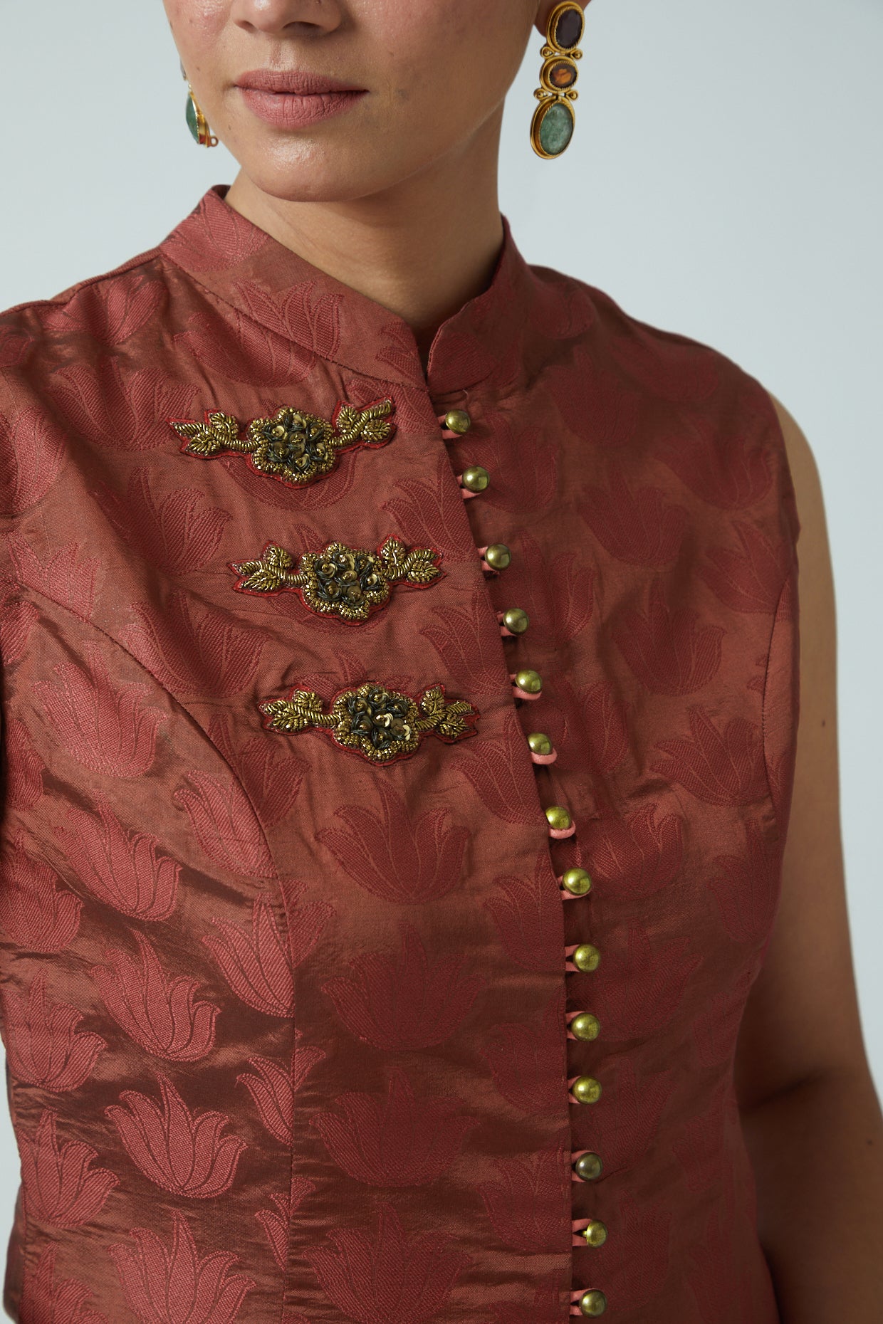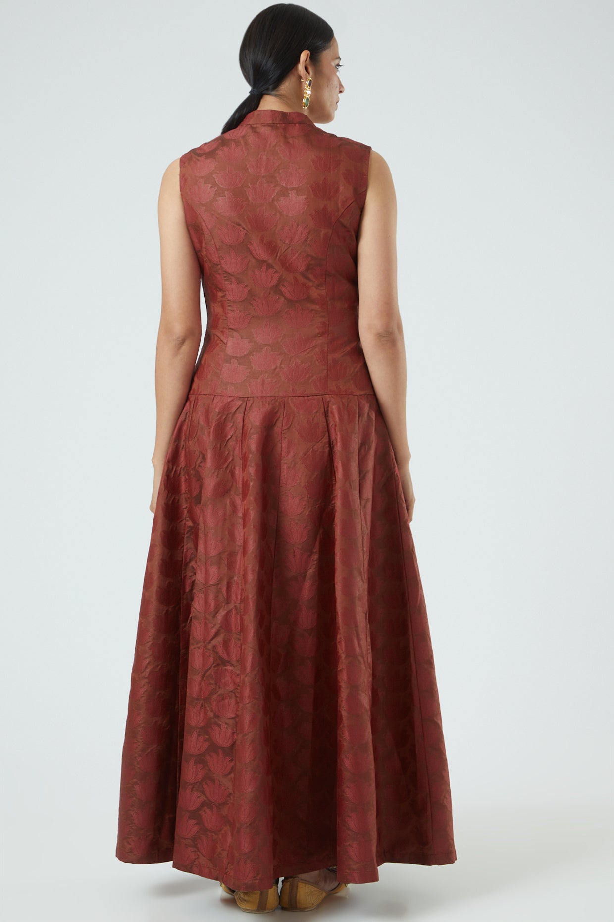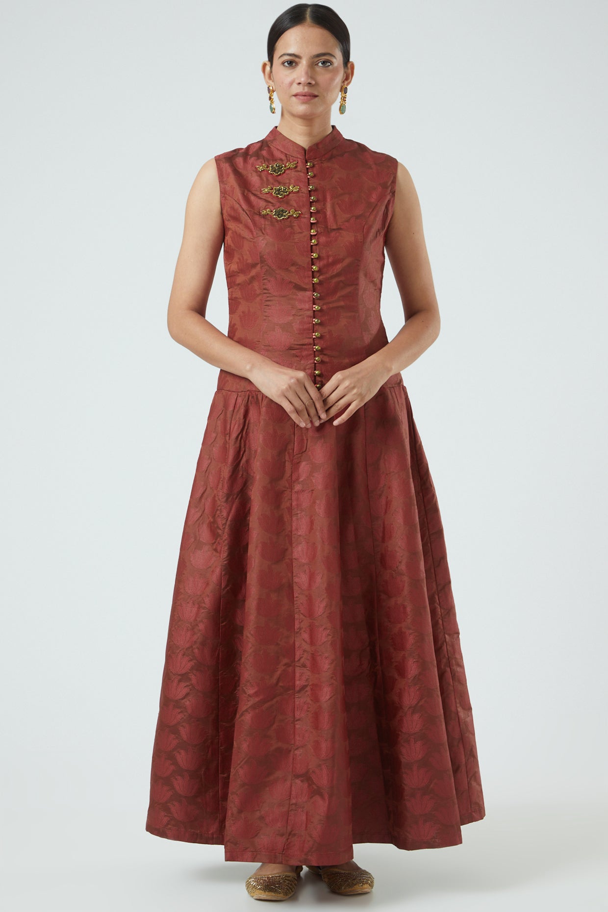 Featuring a maroon maxi dress in jacquard silk blend base with floral print, zardosi embroidery and brass buttons.