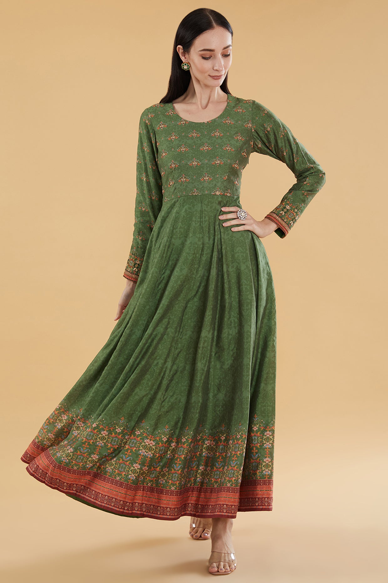 Featuring a mehendi green maxi dress in cotton silk base with floral print and embroidery. Accentuate it with minimal jewellery and heels for a festive look.