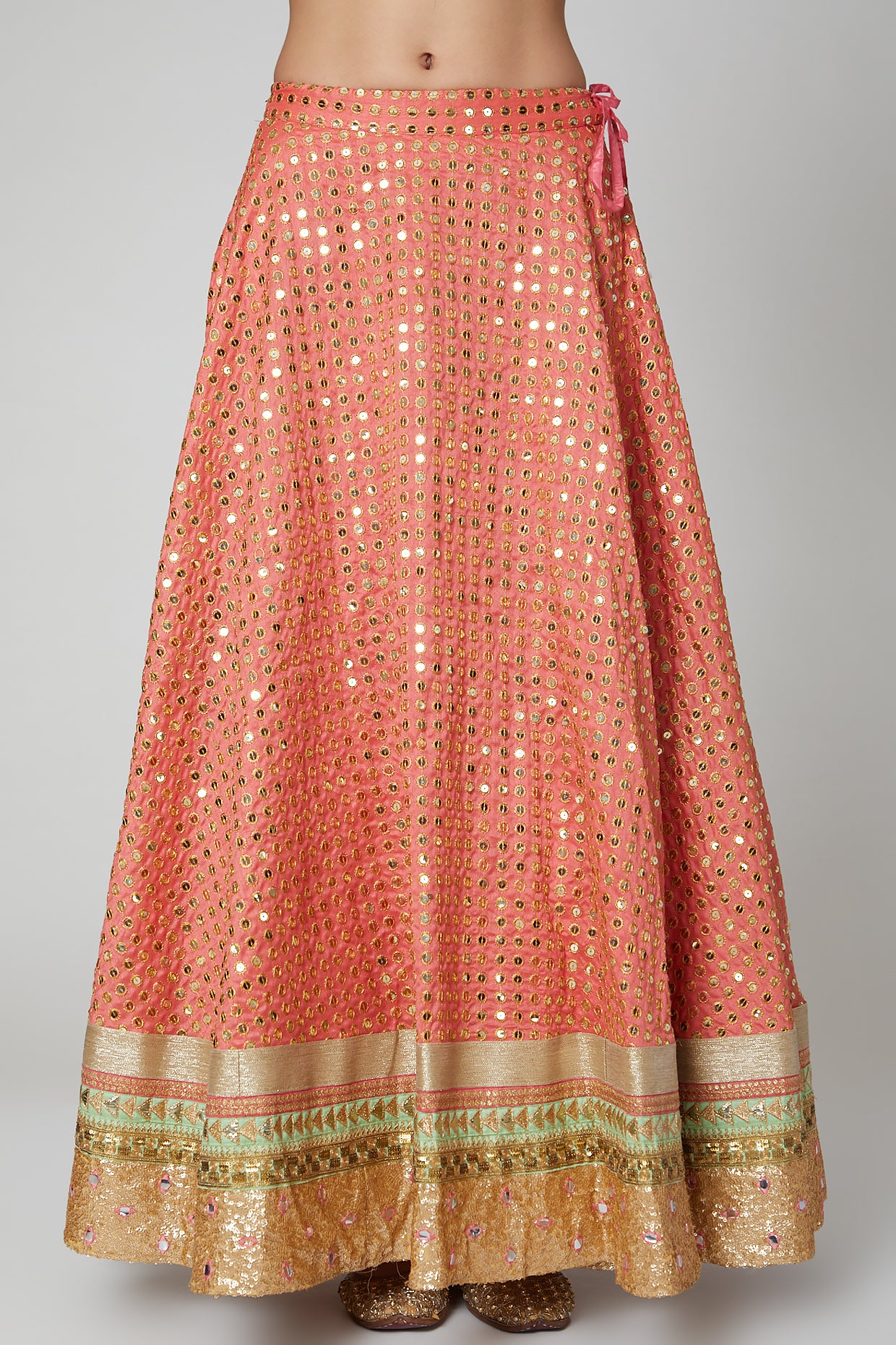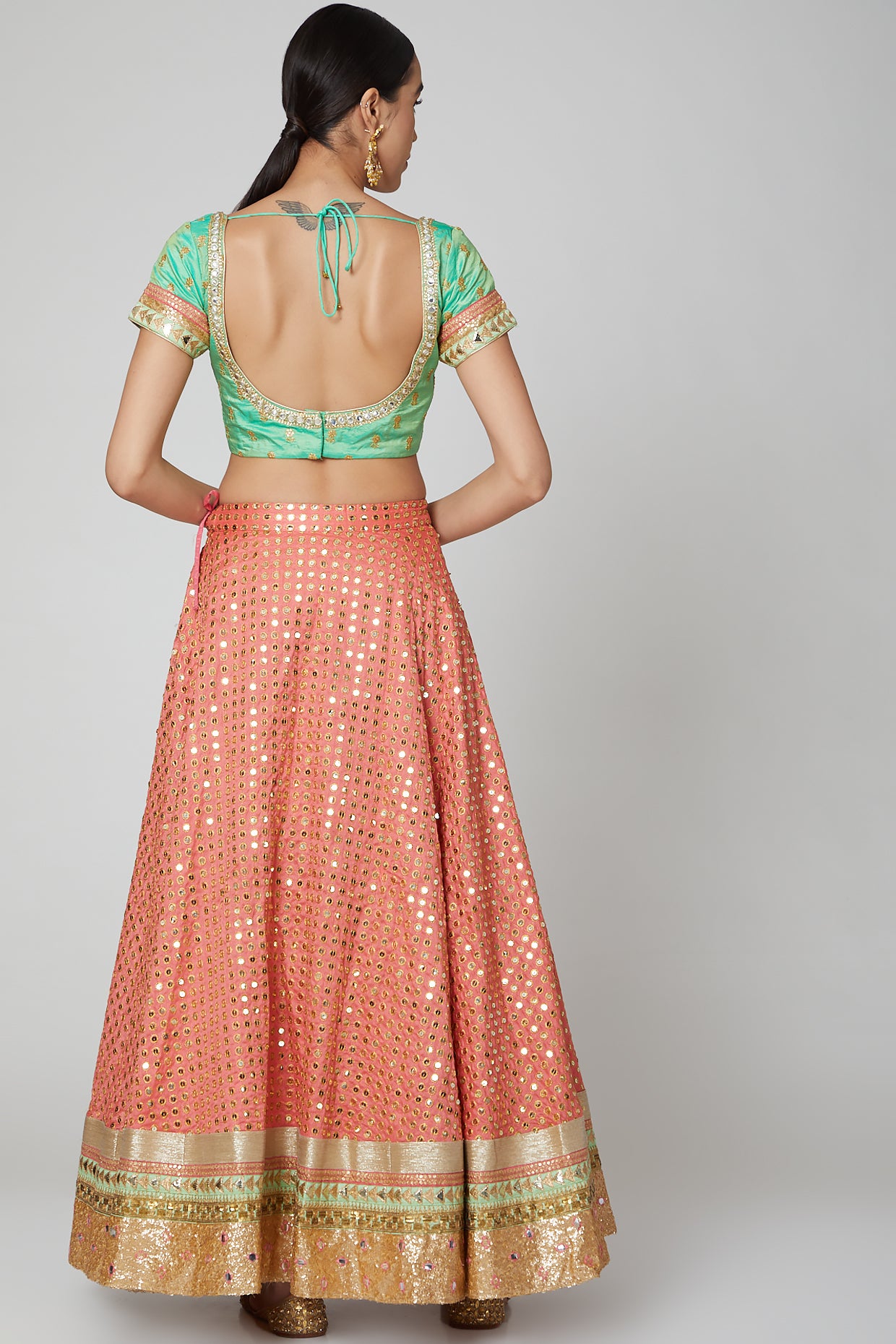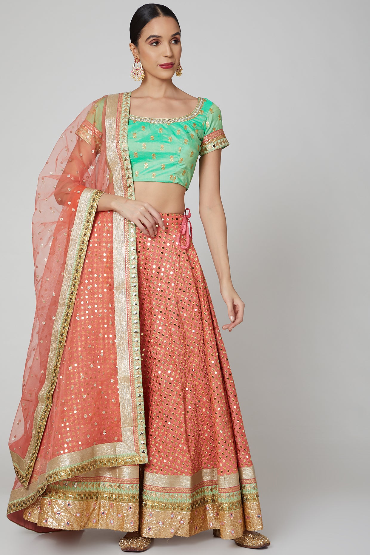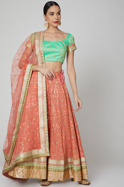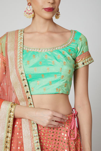 Featuring a peach and pista lehenga in silk base with sequins embroidery. It is paired with a matching blouse and a net dupatta.
