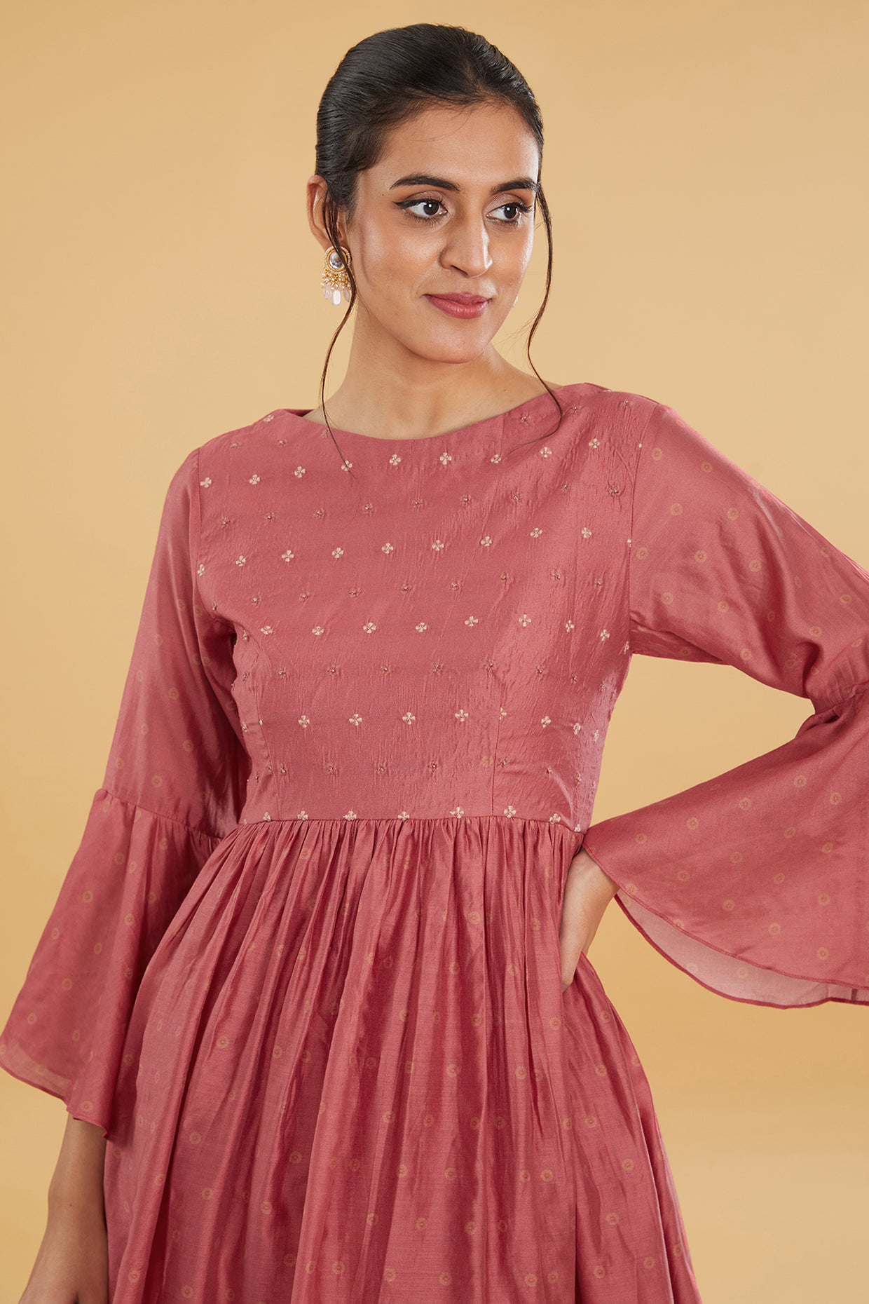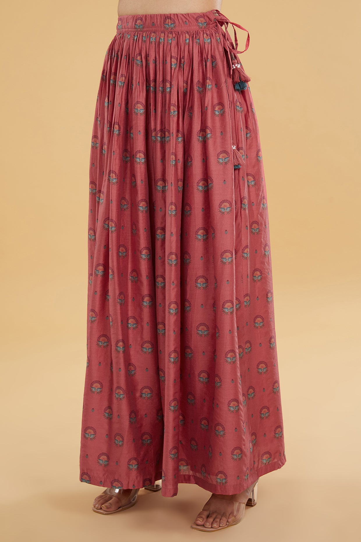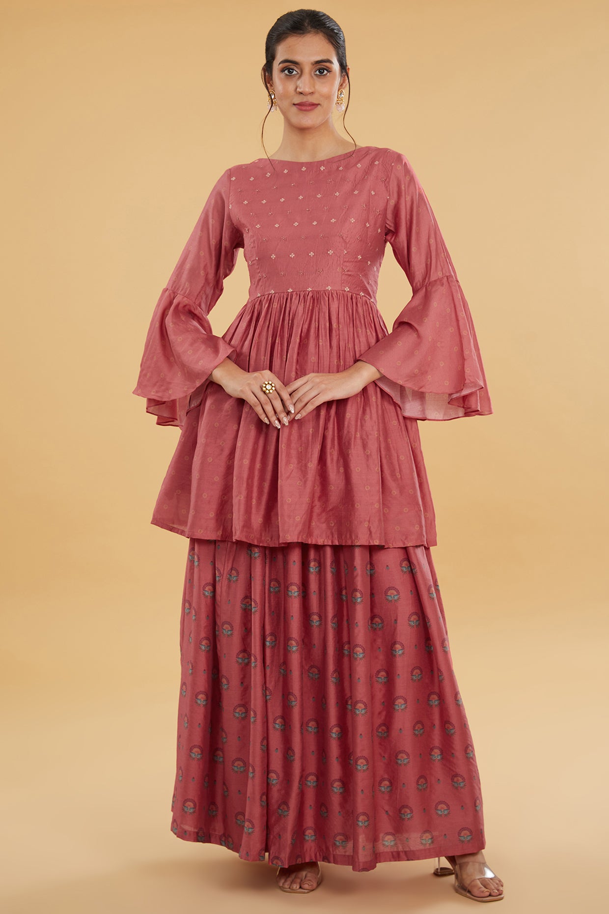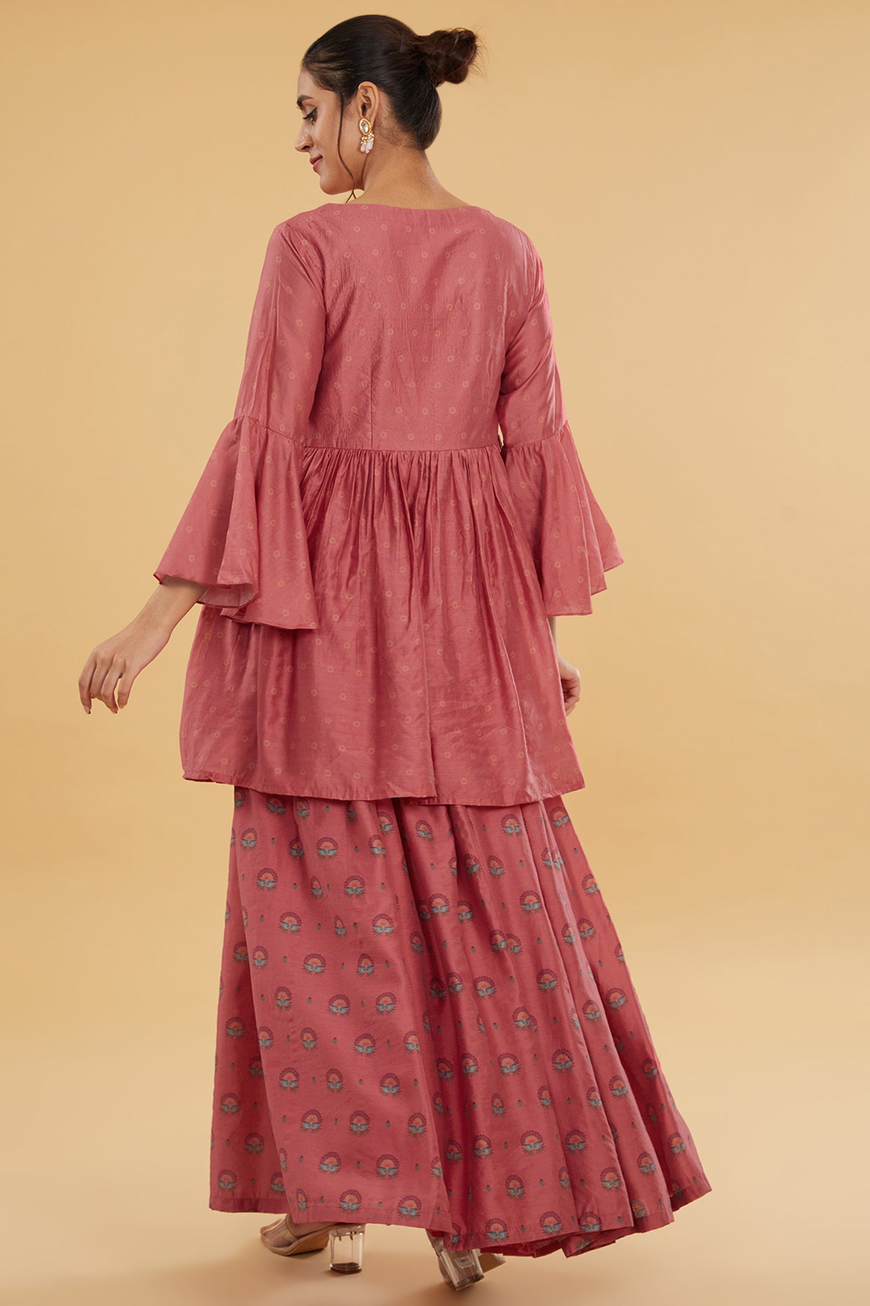 Featuring a pink flared short kurta in cotton silk base with floral print. It is paired with a printed skirt. Accentuate it with minimal jewellery and heels for a festive look.