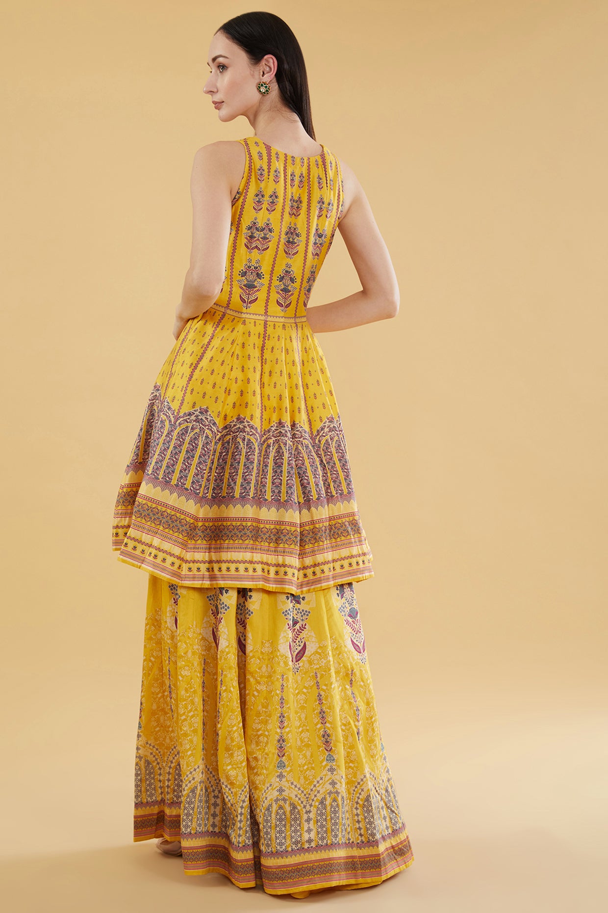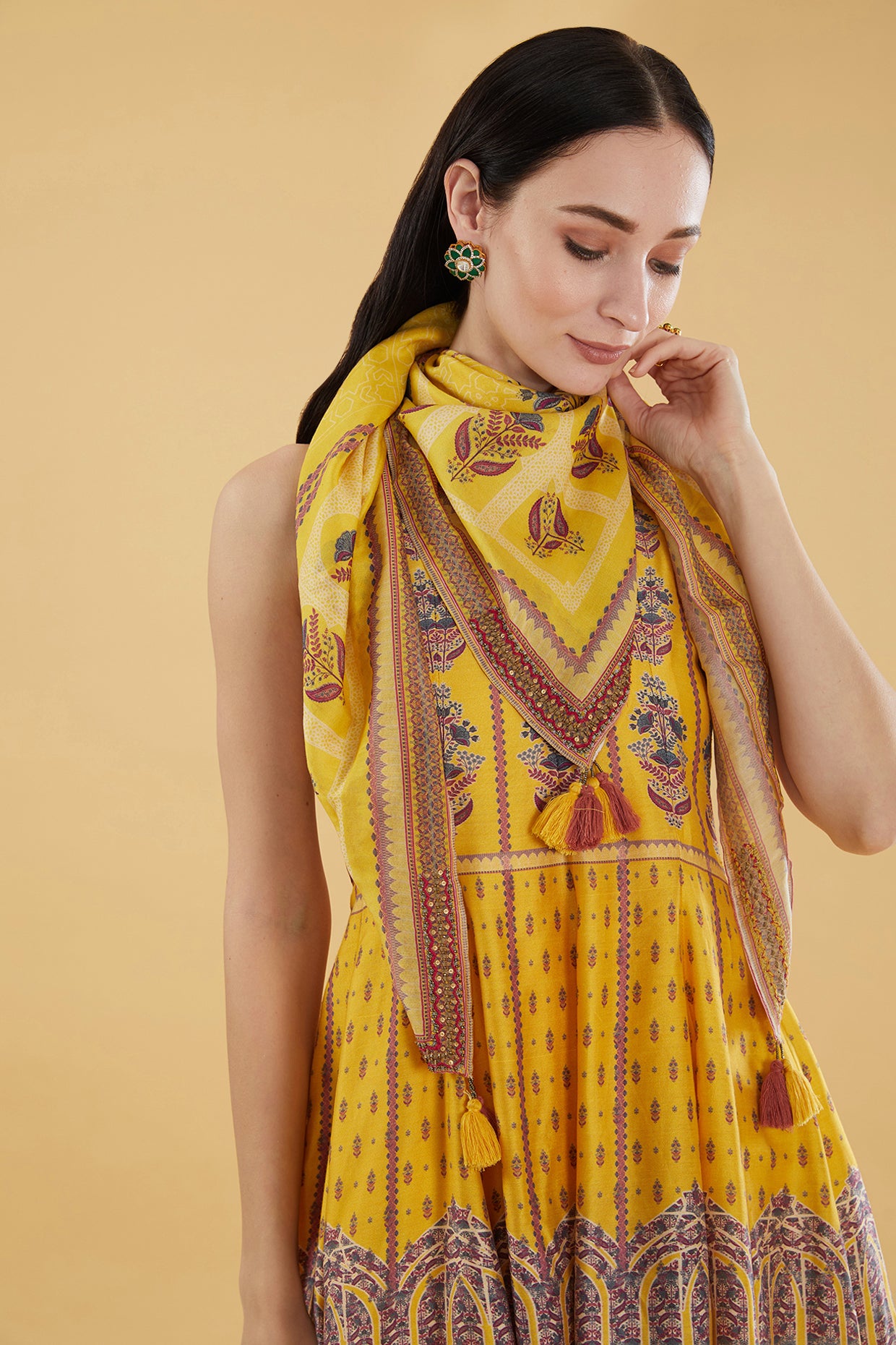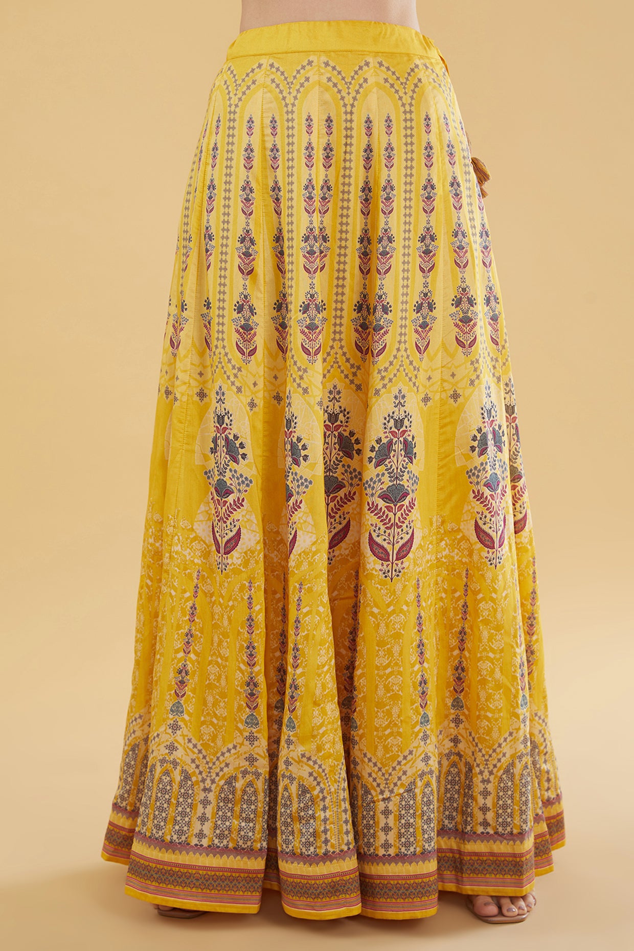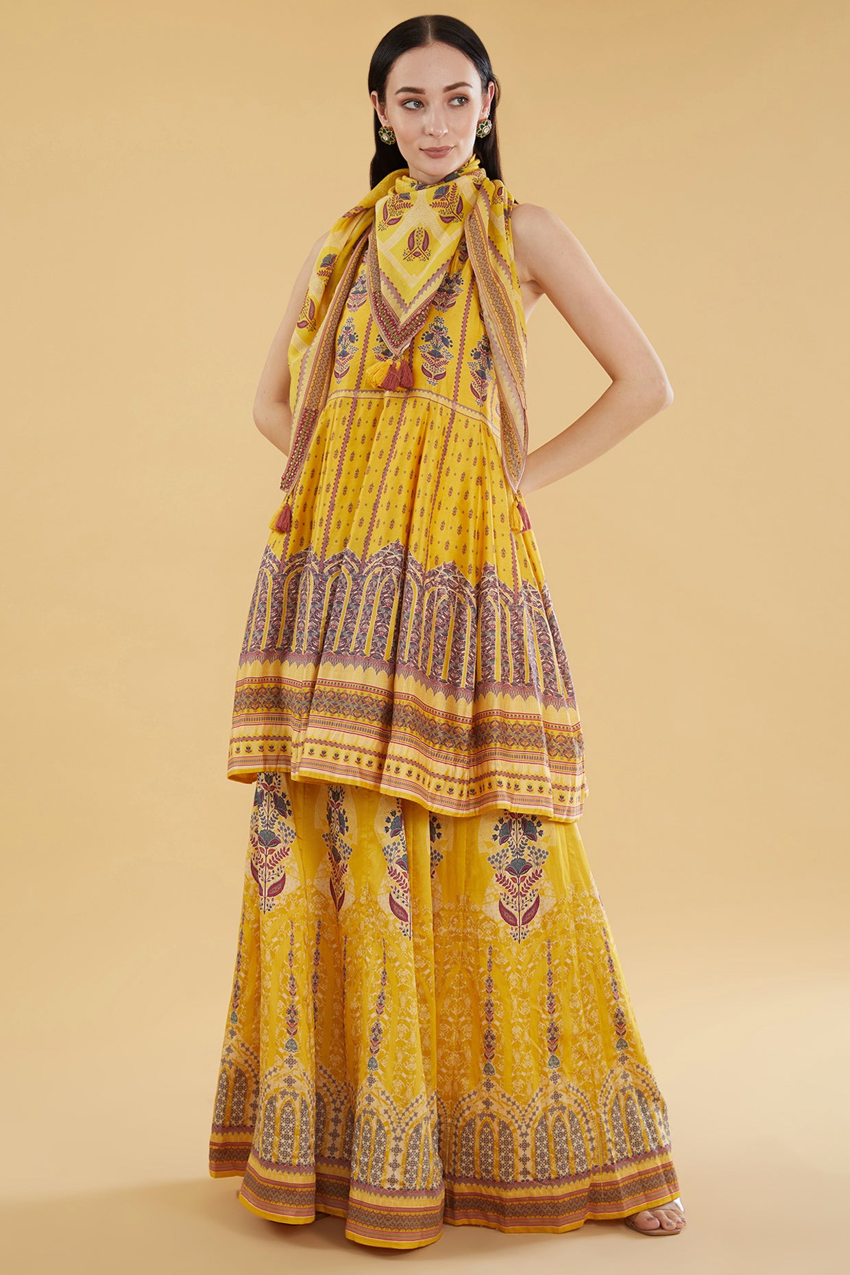 Featuring a yellow kurta in cotton silk base with floral print. It is paired with a skirt and a scarf. Accentuate it with statement jewellery and heels for a festive look or haldi ceremony.