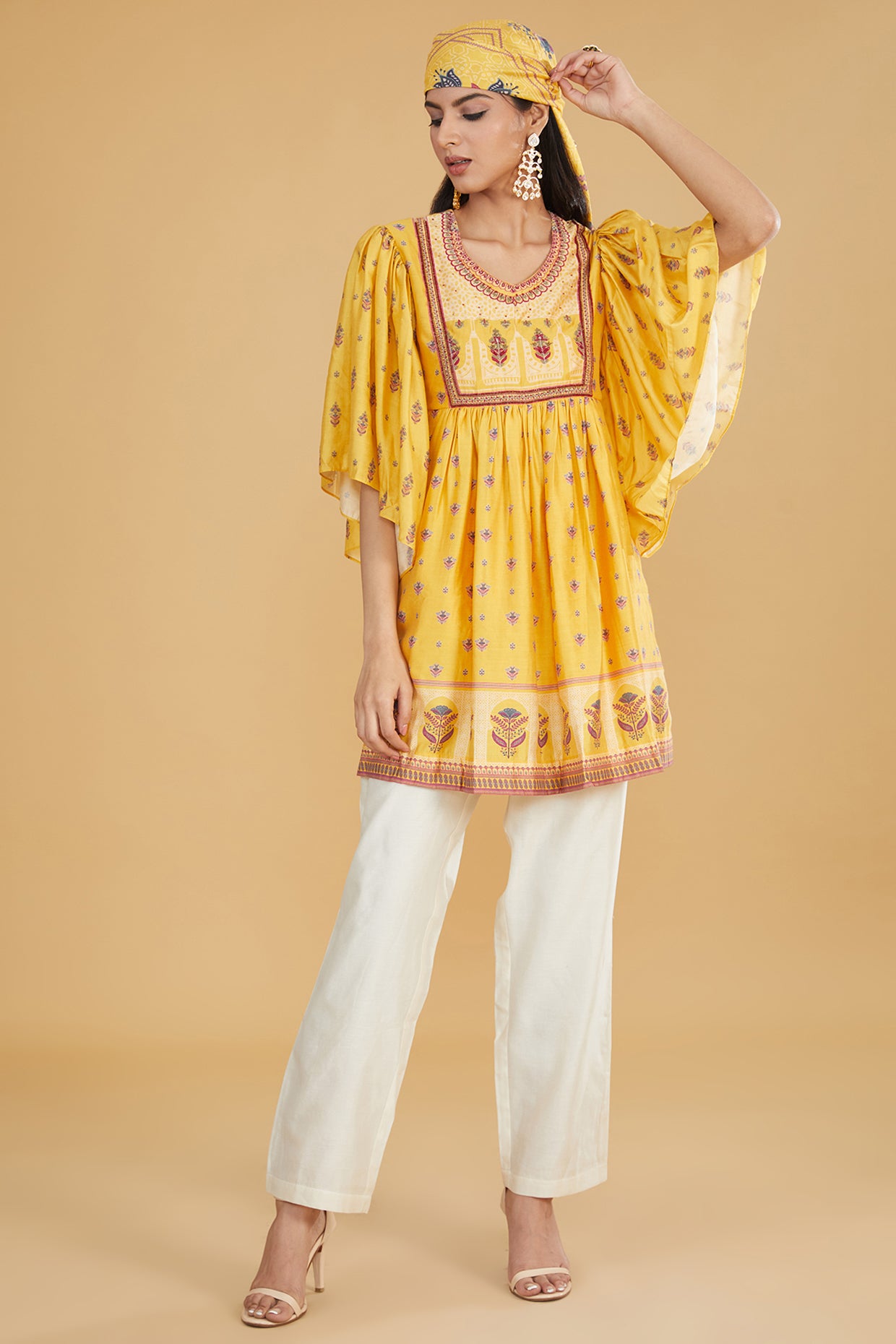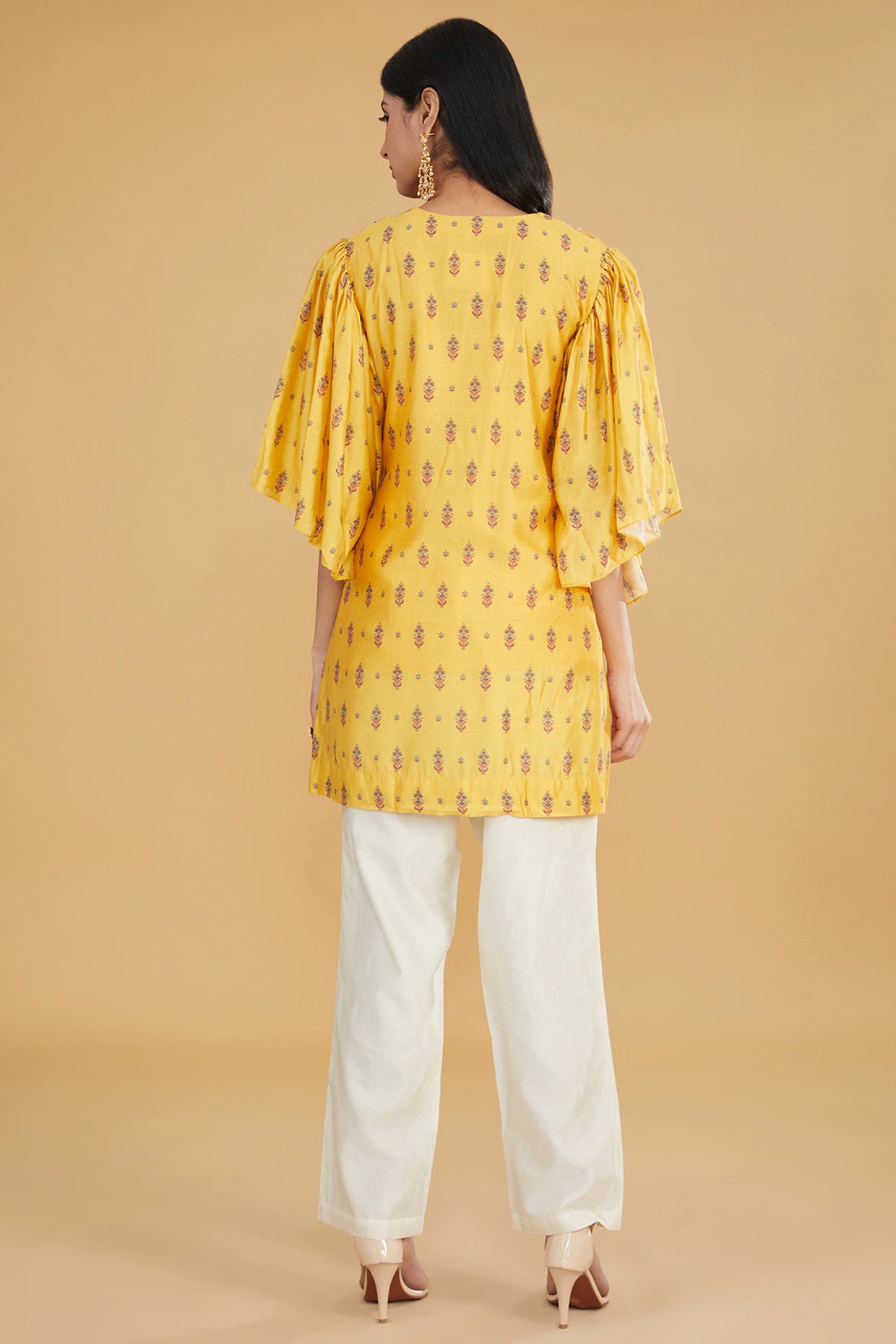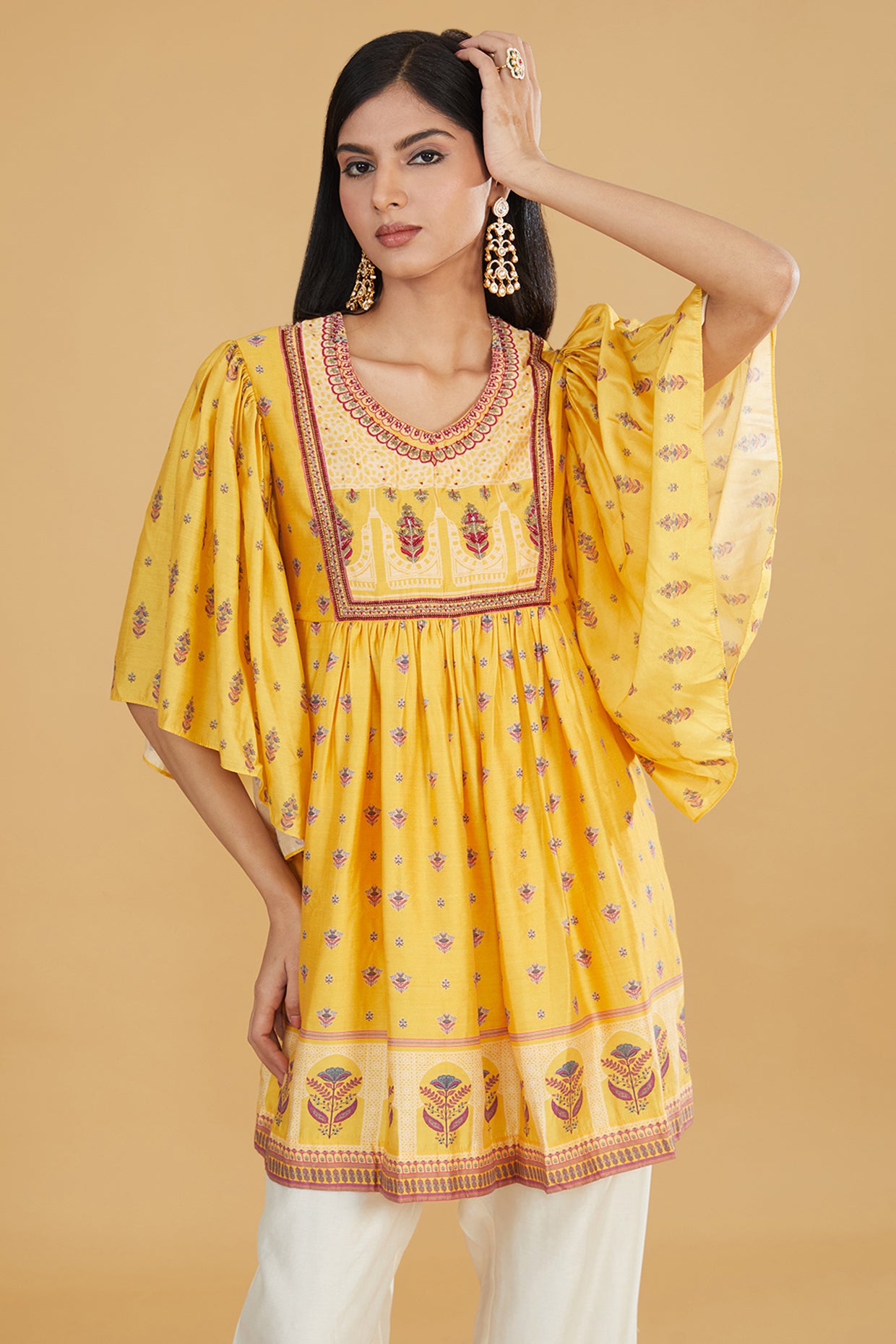 Featuring a yellow loose top in cotton silk base with floral print. Accentuate it with statement jewellery and heels for casual wear.